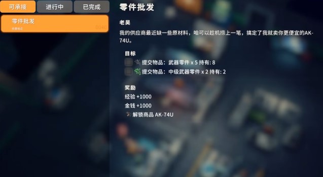 接了泽维尔的任务之后,打开任务日志可以看到,他因为缺材料,需要你帮忙找一些零件。作为回报,他会给你更便宜的AK-74U步枪价格。