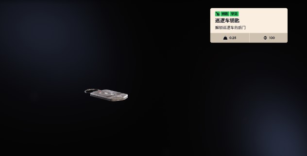 巡逻车钥匙属于“不常见”物品,重量很轻,只有0.25公斤,而且不能堆叠,一次只能带一把。如果你真想卖掉它,商店会出100信用点,但通常来说,直接在“蓝门”的隧道里使用它,回报会高得多。