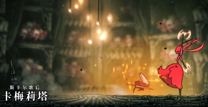 斯卡尔歌后卡梅莉塔可算是《空洞骑士:丝之歌》里设计得相当精彩的一个BOSS战。这位女王的战斗风格特别有意思,她双手各持一把匕首,打起架来就像在跳一支致命的舞蹈。虽然她的每个动作看起来都很优美,但伤害却一点都不含糊。整场战斗发生在一个精心设计的舞台场景中,让这场生死对决更像是一场华丽的演出。