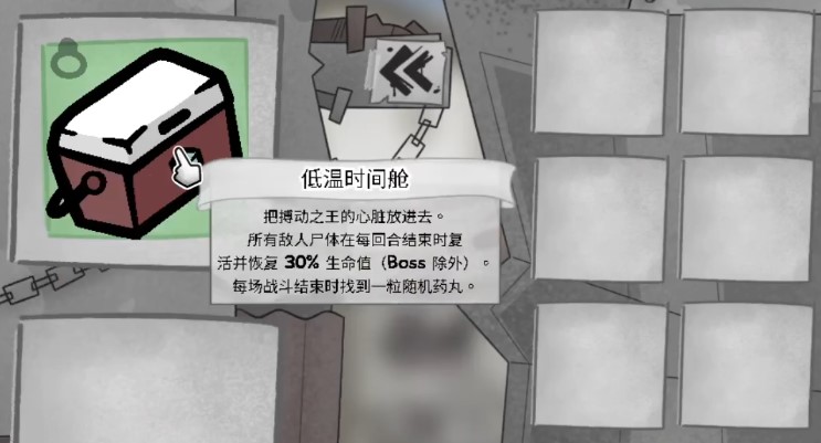 低温时间舱就是件让你做任务用的饰品,戴着它打架,所有小怪每回合结束都会复活。普通版敌人残血复活,打完给颗药;搏动版敌人满血复活,但送你+2生命回复。做任务期间必须有一只猫戴着它,可以换猫但不能摘。只要戴着这玩意儿,就别想速战速决了,做好打持久战的准备吧。