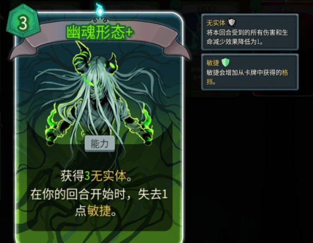 简单说,用了幽魂形态后,你会获得好几回合的“无实体”状态。这个状态超级厉害,怪物打你,不管原来伤害多高,都只能打掉你1点血。但是,代价是每回合开始你会永久丢掉1点“敏捷”。