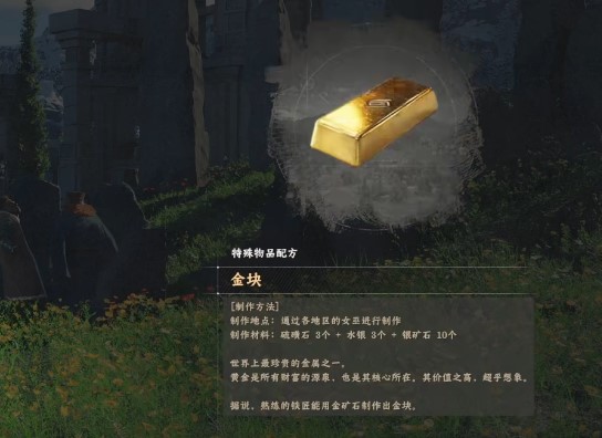 前期在雄狮大宅里有个隐藏壁炉,里面能摸到一块金块。后期解锁了制作配方,就可以找女巫自己做,材料是:硫磺 x3、水银 x3、银矿石 x10。