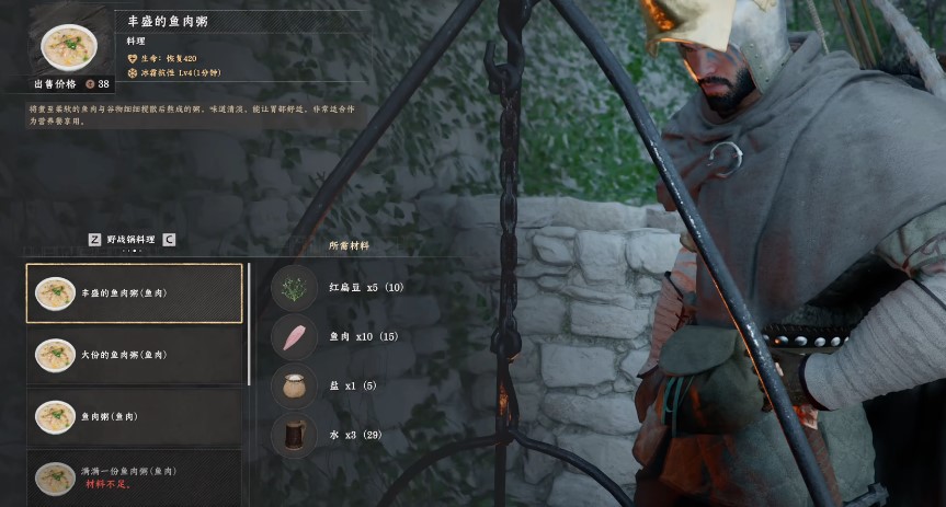 先把「鱼肉粥」食谱学了,去篝火那边,选「野战锅」这个烹饪页面,用基础配方做3份鱼肉粥。