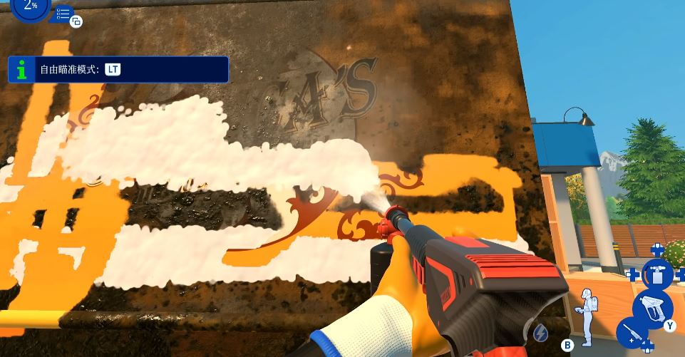 分屏模式下所有游戏功能都能正常使用,比如喷泡沫清洁剂、爬梯子、甚至垂降作业都没问题。而且两个人一起干活时,都能赚到强力冲洗点数哦!
