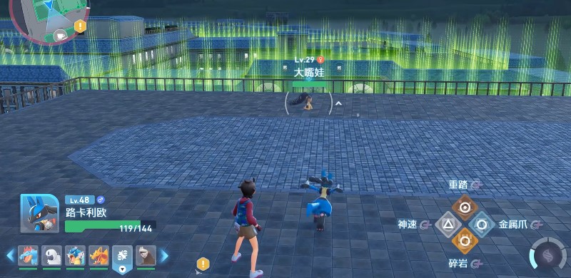完成主线任务“追逐神秘宝可梦!”之后,前往这个区域的西南角,爬上梯子到达屋顶平台,就有机会遇见大嘴娃啦!