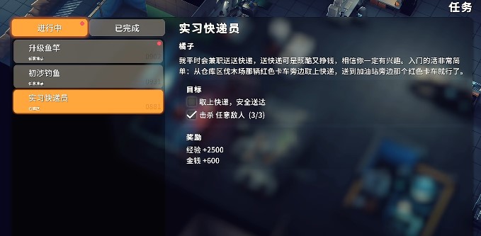 首先,你得找到发布任务的NPC——“橙子”。和他对话之后,任务就正式开始了。这时候,打开你的任务日志,会看到一段这样的描述:“我平时会兼职跑快递——不仅很酷,收入也不错。你肯定感兴趣。去仓库区的木材加工厂附近找辆红色卡车拿到包裹,然后把它送到加油站旁边的另一辆红色卡车那里。” 简单来说,任务内容就是“取件+送货”两步走。不过,可别小看这个过程,路上并不安全哦!